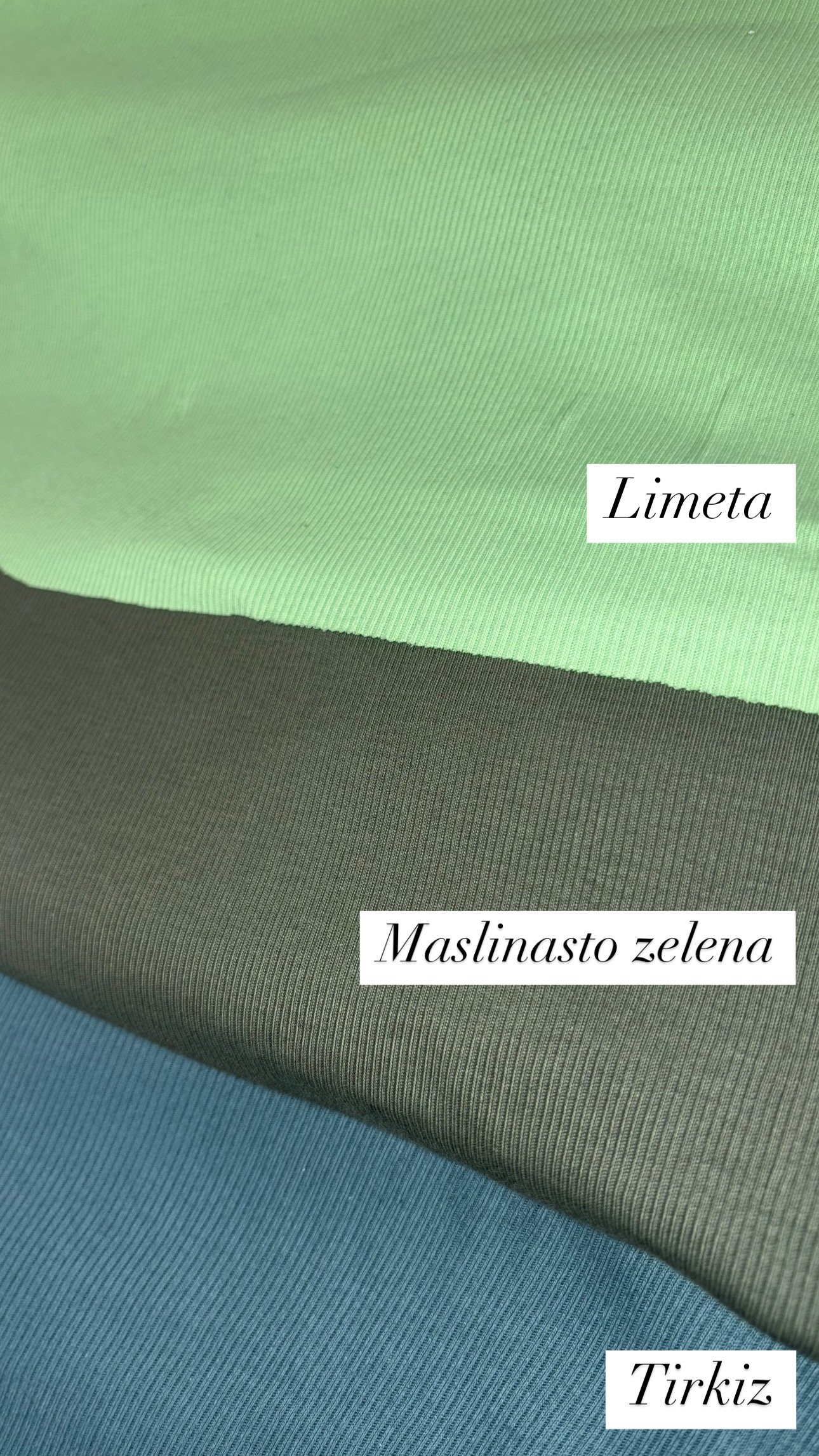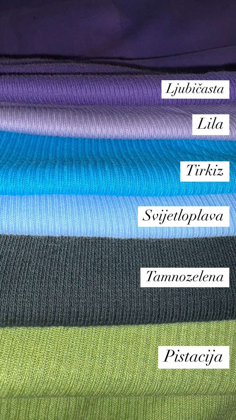 CRNA, PETROLEJ PLAVA, BABY ROZA, SVIJETLOPLAVA,  TAMNOZELENA, MASLINASTOZELENA,  TAMNOPLAVA I TAMNOSIVA, LIMENTA, TIRKIZ, PISTACIJA… I SI OSTALI -MATERIJALI SU MALO DEBLJI ZA RAZLIKU OD GORE NAVEDENIH I SASTAV IM JE 95% PAMUK %% ELASTAN 😉